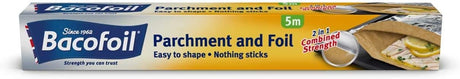 Bacofoil 2-in-1 is a dual-sided kitchen roll with non-stick parchment on one side for baking and strong aluminium foil on the other for wrapping and covering. It's 300mm wide by 5m long, heat-safe up to 220°C, and perfect for ovens and grills.