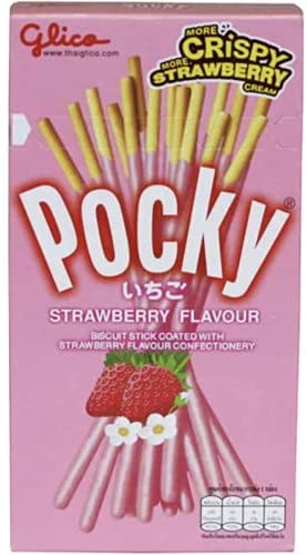 Keywords: Glico Pocky Strawberry, Japanese snack, biscuit sticks, strawberry flavour, sweet treat, crunchy biscuits, 45g pack, authentic Japanese, UK snack, food cupboard, confectionery.